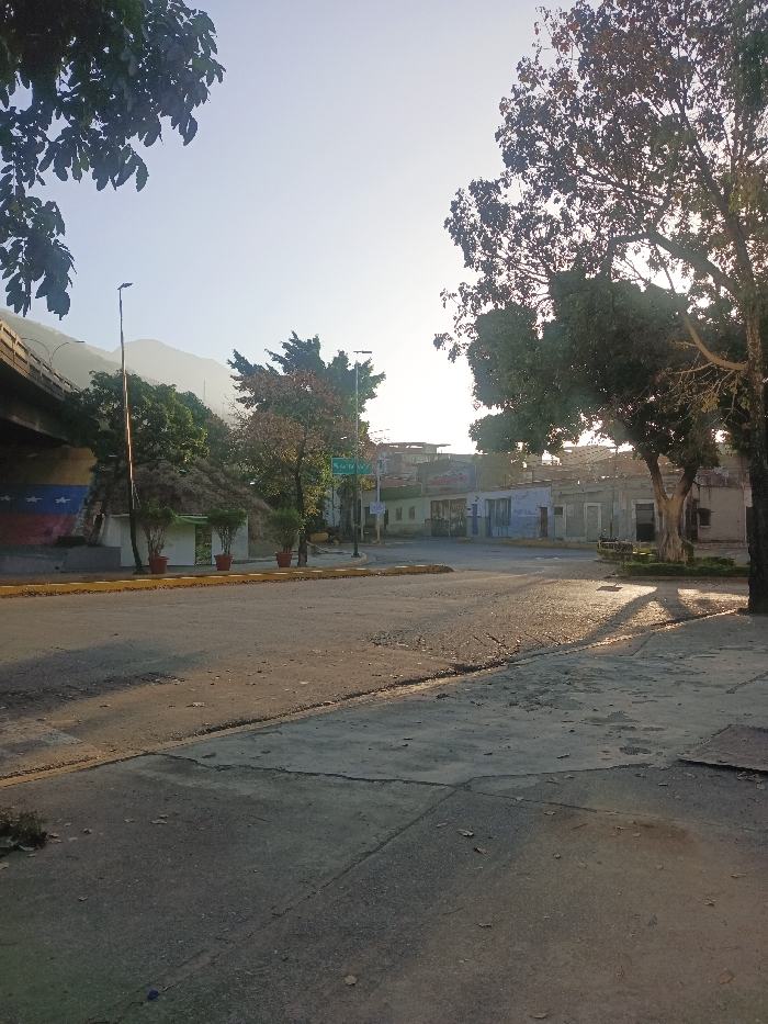 The image depicts an urban street scene at an intersection, likely in the City of Unknown, Unknown, under bright, possibly early morning or late afternoon, sunlight. The scene is devoid of individuals or active interactions. In the foreground, a cracked concrete sidewalk leads to an asphalt road with visible wear, including potholes and patches. Yellow painted curbs delineate the road from the sidewalk. Sunlight casts long shadows from the right across the road and sidewalk. To the left, an elevated concrete overpass or bridge spans across the upper portion of the frame. Beneath it, a wall features a large mural resembling the Venezuelan flag, displaying horizontal stripes of yellow, blue (with white stars), and red. A steep, vegetated embankment rises from below the bridge. At its base, a small, white, low-rise structure with a thatched roof is visible, fronted by four potted plants with green foliage. A tall street lamp stands between this structure and the bridge support. Hazy mountains are discernible in the far background behind the overpass. In the midground, another street lamp is visible further down the road, alongside a partially obscured green street sign that appears to read "La El T[...]." A row of single to two-story buildings, some with faded paint in shades of blue and light green, line the street on the right. Most buildings feature flat roofs. To the right, a large tree with dense green foliage occupies the upper frame, with sunlight filtering through its leaves. Closer to the center-right, a smaller, gnarled tree with green foliage is situated next to a small, raised planter bed containing green plants, adjacent to the concrete sidewalk.