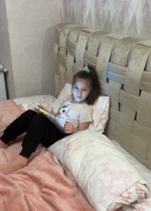A young girl with brown hair in a high ponytail sits on a bed with a light pink blanket. She wears a short-sleeved beige t-shirt with a unicorn graphic, black pants and pink socks. The girl holds a tablet in her hands, looking at it, then looks up and smiles at the camera and makes fists, moving her arms up and down. The headboard of the bed is woven with a light brown material. There's wallpaper with a geometric pattern on the wall behind the bed. Music is playing in the background.