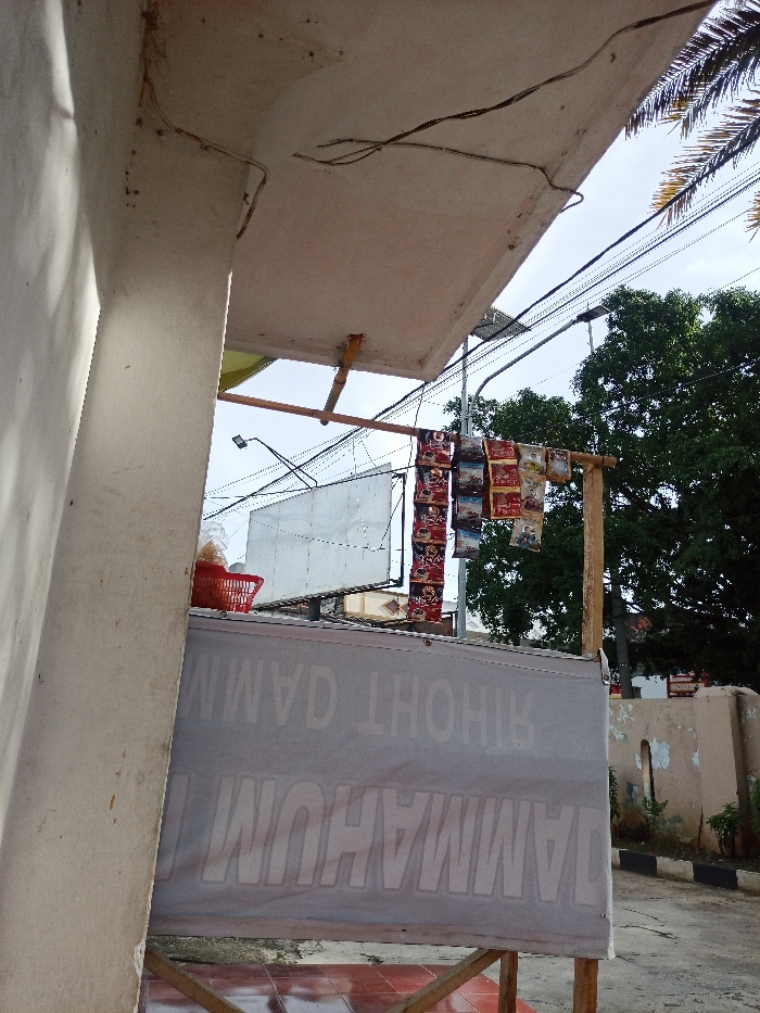 A partially obscured outdoor scene shows a small roadside shop. Hanging snack packets are suspended from a wooden beam. A large banner with reversed text partially covers the shop's front. A red basket sits atop the shop's counter. In the background, there's a white sign, utility poles, and lush green trees. A weathered building and street are visible further back. The image is taken from a low angle under the shade of a roof.