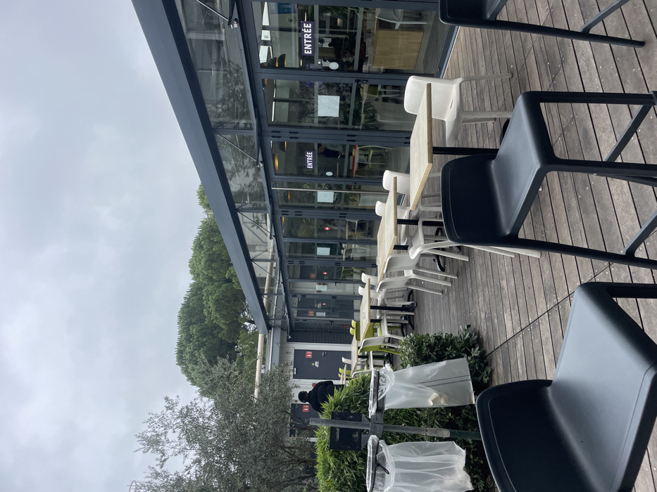 The image displays an outdoor dining terrace associated with the Cafeteria CROUS Richter, located at Campus Richter, Place Eugène Bataillon, 34095 Montpellier, France. The scene is under an overcast, light grey sky. The terrace floor is constructed from dark wooden planks. In the foreground and midground, numerous rectangular dining tables with light-colored tops and dark metal bases are arranged with a variety of chairs. These include white and light green standard dining chairs, as well as several dark grey high bar stools, two of which are prominent in the immediate foreground. Adjacent to the terrace is a single-story, modern building with a dark grey sloped roof and a facade consisting of multiple large glass panels framed in dark grey. Several glass doors feature white "ENTRÉE" signs. The interior, visible through the glass, shows additional seating and indistinct figures. To the left of the seating area, green shrubbery separates the terrace from a path. Within this shrubbery, a dark metal pole supports two suspended white plastic trash bags. Further left, mature trees with light grey-green foliage are visible. In the background, behind the building, a line of dark green evergreen trees is visible against the sky. One individual, dressed in a dark jacket, is observed walking away from the camera in the far left background, near a lighter-colored section of the building where two red emergency signs are affixed. Faint human figures are discernible through the building's glass doors.