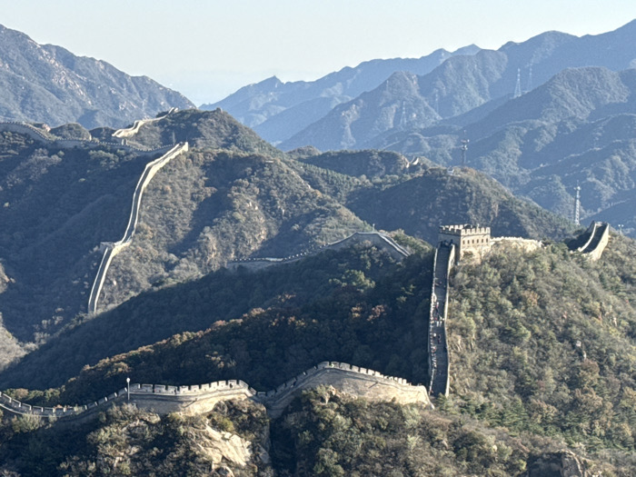 An elevated, expansive view depicts segments of the Great Wall of China traversing mountainous terrain within Yanqing District, China. The primary subject is the ancient stone and brick wall, which winds distinctly along multiple ridgelines and steep inclines. A prominent, well-preserved watchtower featuring crenellated battlements stands on a midground peak. A long, steep section of the wall ascends towards this watchtower, populated by multiple small human figures engaged in ascent and descent. Another visible segment of the wall runs horizontally across a lower ridge. The surrounding landscape consists of densely forested mountains, displaying a mixture of green and autumnal brown foliage. Distant mountain ranges recede into the background, softened by atmospheric haze, with faint, slender structures resembling communication towers visible on some distant peaks. The sky is clear, and the scene is illuminated by natural daylight, generating distinct shadows that highlight the contours of the mountains and the Great Wall. No specific interactions beyond pedestrian movement on the wall are discernible.