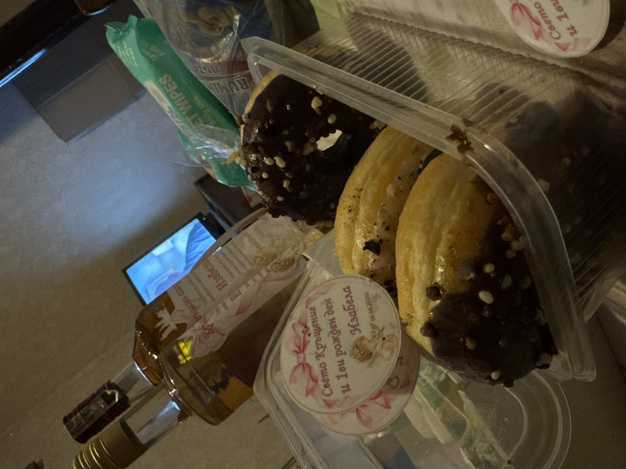 The scene appears to be an indoor setting. There is a plastic container of donuts with chocolate frosting, next to a bottle of alcohol with a label in Bulgarian, reading "Свето Кръщение и 1ви рожден ден Изабела" (Holy Christening and 1st birthday Izabela), and a baby wipe package. The label on the alcohol bottle also has the name "Изабела" repeated. The presence of a TV screen showing a person is discernible in the background. There is no clear indication this image was taken in Borovo, Bulgaria.