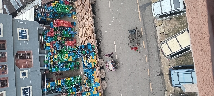 The image captures an elevated view of a bustling commercial street in Aba, Nigeria. A prominent three-story grey building with multiple windows and an open ground floor dominates the upper portion of the frame. The ground level functions as a distribution center, with hundreds of plastic crates, colored green, blue, yellow, and red, stacked high both inside the building entrance and along the sidewalk. These crates appear to contain bottled goods. A large multi-axle flatbed truck, its trailer loaded with numerous wooden pallets, is parked parallel to the curb on the asphalt street. Several individuals are present: multiple people are visible near the stacked crates, engaged in material handling. On the street, one individual in a dark red shirt pushes a two-wheeled cart laden with colorful items across the pavement. Further along the street, another person in a red shirt interacts with an overturned metal trolley. In the foreground, three passenger vehicles—one dark blue and two light-colored SUVs/vans—are parked perpendicularly on a concrete parking area. The asphalt road features white dashed markings.