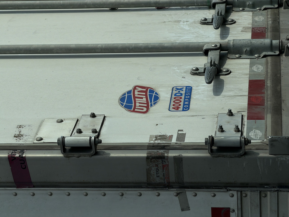 back of a Utility trailer. Two metal bars run horizontally across the trailer doors. There are two sets of latching mechanisms on the top door. The trailer has Utility stickers and logos. The words "4000D-X Composite" are visible on one sticker. The bottom door shows hinge mechanisms and remnants of stickers. The bottom of the trailer has rivets running along the bottom.