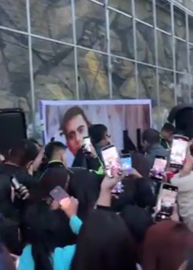 musician performing for a crowd outside, with many people holding up their phones to record. The musician is wearing sunglasses and a black jacket, and standing in front of a backdrop featuring his image. The crowd is a mix of genders and ages, with some wearing casual clothing and others security attire. The background includes a wall made of textured stone blocks.