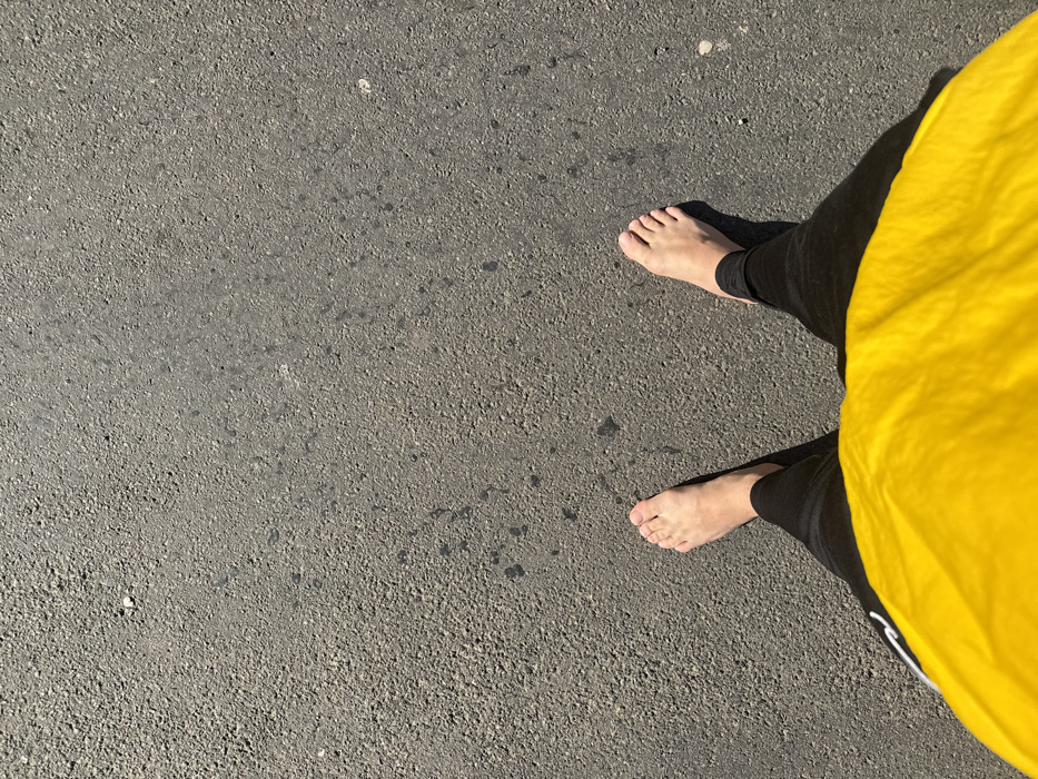 The image presents a first-person, overhead perspective, focusing on the feet of an individual standing on an outdoor paved surface