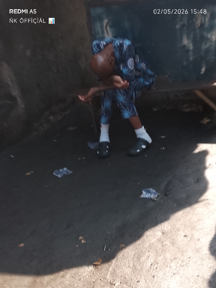 An individual in a blue patterned top and capri pants stands hunched over on a dirty, dimly lit surface. They wear white socks and black Crocs-style shoes. Scattered debris litters the ground. The setting is stark, possibly an alleyway or neglected area. The image includes a timestamp of "02/05/2026 15:48" and the text "REDMI A5" and "NK OFFICIAL."