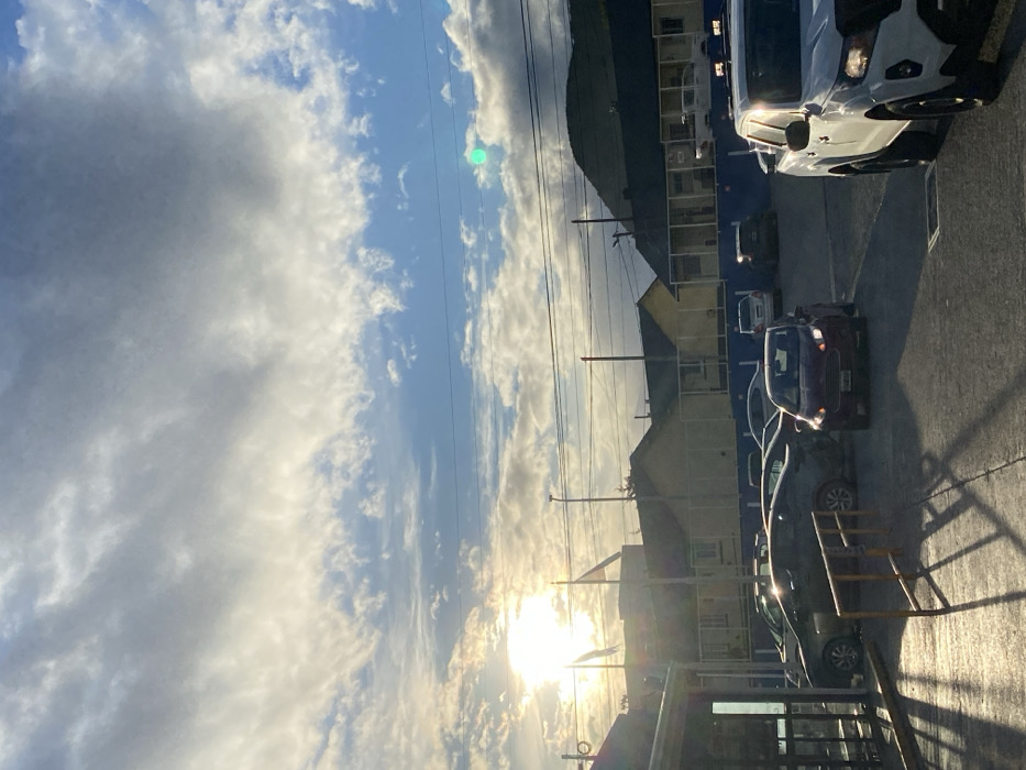 A daytime outdoor scene features a bright sun shining through clouds in a blue sky. A mountain range looms in the background. The foreground shows a street with parked cars, utility poles, and buildings. The perspective is rotated, giving a tilted appearance. The sunlight casts long shadows across the pavement, and lens flare is visible near the sun.