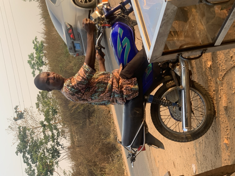 The image portrays an outdoor scene in Kabba, Nigeria, during conditions suggestive of late afternoon or early morning sunlight. An adult male is seated on a blue motorcycle, positioned on a dirt shoulder adjacent to a paved road. The man, with dark skin and a short haircut, wears a short-sleeved, patterned tunic featuring brown, orange, and blue/teal hues, along with dark trousers. His hands grip the motorcycle handlebars, and he is looking directly towards the camera. The motorcycle is a blue model with a black seat, chrome grab handles, a chrome exhaust pipe on the right side, and spoked wheels. Green and light blue decals adorn the fuel tank. In the background, a silver Lexus sedan is partially visible on the paved road. Behind the road, a bank of dry, wild vegetation and several trees with sparse green foliage are present. Faint power lines are discernible against the light sky. In the bottom right foreground, a metallic-framed glass display case is partially visible.