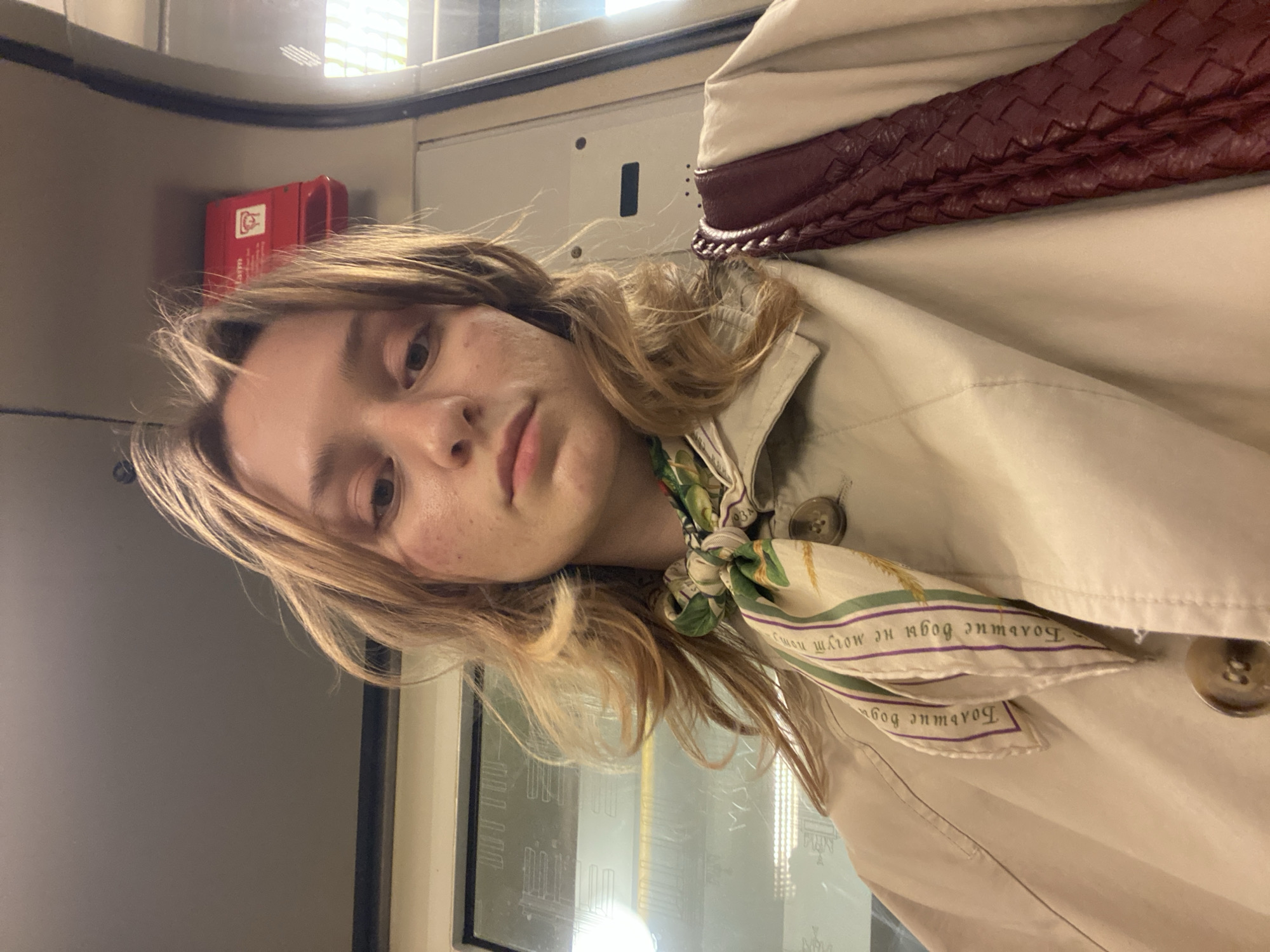 A young woman is taking a selfie inside what appears to be a train car. She has blonde hair and is wearing a light-colored trench coat with a patterned scarf tied at the neck. Behind her, there is a window with reflections of buildings or structures. A red emergency box is visible on the wall above her head. The setting resembles a public transportation vehicle, possibly a train, but there is insufficient detail to confirm that the image was taken in Berlin, Germany.