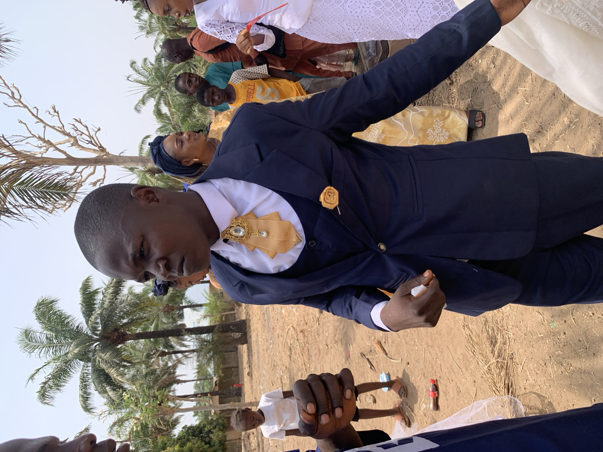 The scene depicts an outdoor gathering in the city of Washo, Nigeria, under bright daylight conditions. A young adult male, of dark complexion and short dark hair, is positioned slightly right of center in the foreground. He is wearing a dark navy three-piece suit over a white dress shirt, accented by a gold cravat with a prominent jeweled brooch and a gold rose lapel pin. His gaze is directed to his left, and his expression is serious. His right hand is slightly extended, appearing to hold or interact with a white, possibly satin, fabric. To his immediate left, the forearm and clenched hand of another individual in a dark shirt are visible. In the middle ground, various individuals are present: A woman with a blue headwrap and yellow patterned attire stands behind the central figure, looking forward. To the right of the central figure, a woman in a white lace garment is partially visible, holding a thin red ribbon or strip of fabric. Children are also scattered throughout the scene; one young boy in a white t-shirt and brown sandals stands to the left of the central figure, looking downwards. Another boy in a yellow t-shirt with "PBELL 6" printed on it is positioned behind the woman in the blue headwrap. Further in the background, more individuals are partially visible, including a man in an orange-brown top. The ground consists of dry, light brown soil with sparse debris, including several dry palm fronds, small branches, a light blue plastic bowl, and a dark plastic bottle. The background is characterized by numerous tall palm trees and some deciduous trees with bare branches, under a clear, bright sky.