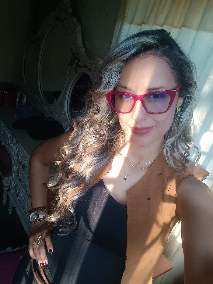 woman indoors in Las Tejerías, Venezuela, illuminated by natural light entering from the left side of the frame. She stands with her left hand positioned on her hip, holding a brown strap. Her hair is long, wavy, and features blonde and grey highlights. She wears red, cat-eye style glasses, a black tank top, and a light brown sleeveless vest. Observable accessories include a delicate silver necklace with a small charm, a second shorter silver chain with two small beads, and small gold stud earrings. On her left wrist, she wears a watch with a white strap and multiple brown beaded bracelets. Two rings are visible on her left hand: one on her ring finger and a gold-colored, abstract-shaped ring on her middle finger. Her fingernails are painted dark red. The background features an ornate white dressing table or console to her left (viewer's right), equipped with at least two oval mirrors that reflect dimly lit portions of the room. Various bottles and objects are visible on the surface of the dressing table. The wall behind the furniture appears light-colored and textured. A light-colored curtain or blind is partially visible on the right side of the image, indicating a window. Strong natural sunlight highlights the woman's right side, casting a shadow across her nose and left cheek.