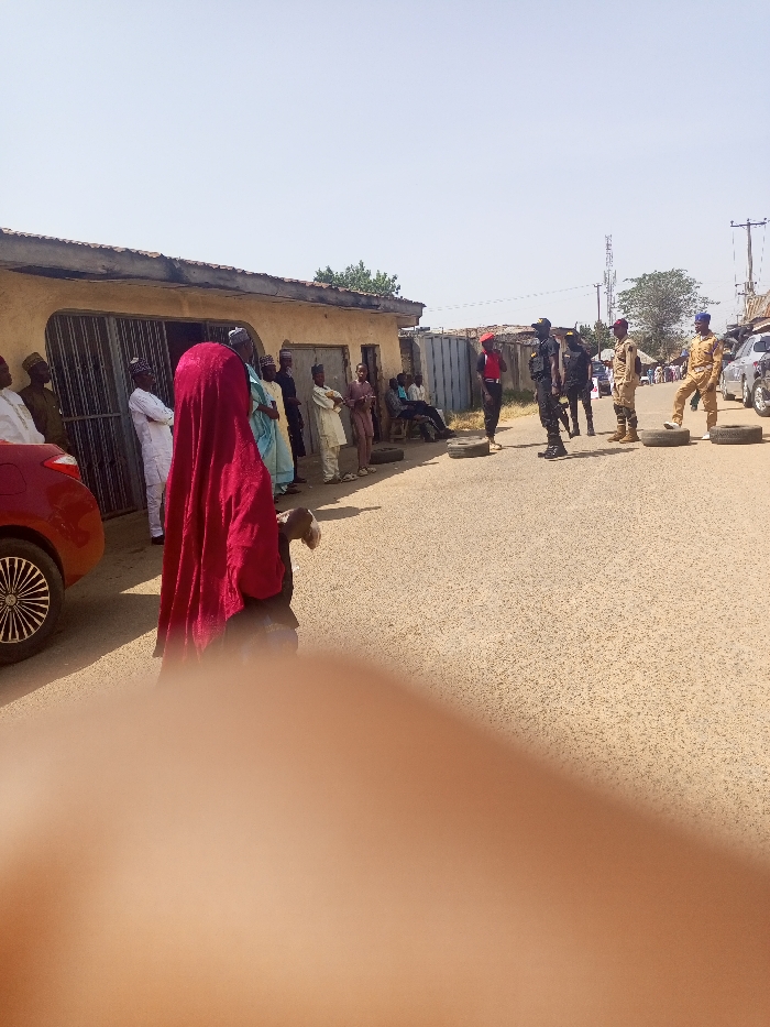 This image depicts an outdoor scene on a paved road in Jos, Nigeria, under clear daylight conditions. In the immediate foreground, a blurred large tan shape, likely a finger or thumb, partially obscures the lower portion of a person wearing dark clothing and a long, flowing deep red garment or robe, facing away from the camera. To the left, a single-story building with a light-colored, possibly stucco, facade and a dark roof line runs parallel to the road. This building features multiple dark, corrugated metal doors or shutters. A group of approximately ten adult males, primarily dressed in traditional Nigerian attire including long tunics (agbada) and caps, stand or sit near this building. A red car is partially visible on the far left, parked in front of the building, showing its rear right quarter and wheel. The central part of the road features four used vehicle tires placed as apparent markers or barriers. Four individuals in various uniforms are positioned on the road. One person in a red beret and red shirt stands near two tires. Behind them, two individuals in camouflage uniforms and dark berets stand; one appears to be holding a rifle. Further down the road, a fourth uniformed individual, in a light brown/khaki uniform and beret, stands with one foot elevated on a tire, also appearing to hold a rifle. In the background, sparse trees, a telecommunications tower, and power lines are visible under a clear, bright sky. A silver or light-colored car is partially visible on the far right side of the road, behind the uniformed personnel. The civilians appear to be observing the scene where the uniformed personnel are positioned.