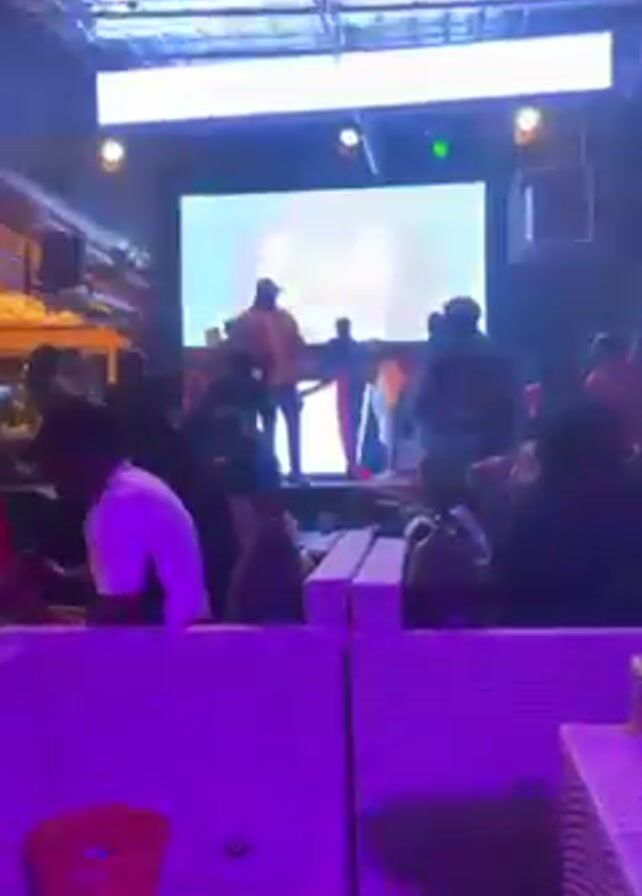 The video depicts an indoor performance setting, possibly a club or a bar, with an audience present. The primary focus is a stage where a performer is singing into a microphone while interacting with a group of individuals who appear to be either dancers or other members of the performing act. A large LED screen behind the stage displays visual graphics and the club's branding, alternating between static and dynamic imagery. The lighting is dominated by purple hues, which add to the club’s ambiance. The audience members are seated on white, wicker-style furniture, and there are also people standing, suggesting varying levels of engagement. The camera appears to be handheld, offering a dynamic view of the scene.
