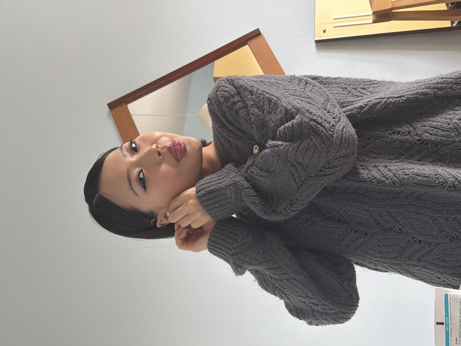 female subject located in an indoor setting in Varna, Bulgaria. She has dark hair styled with a side part and is wearing eyeliner. She is looking towards the viewer with her tongue partially extended. Her hands are raised to her right ear, appearing to adjust or place a small, light-colored earring. A black clip is present in her hair above her right ear. She is dressed in a dark gray, patterned knitted sweater, which features a golden-colored pin on the upper left side. The background consists of a plain light blue-gray wall. In the upper right quadrant, a wooden-framed mirror is visible, reflecting a light interior space and a hanging light fixture. A partial view of another reflective surface in the lower right shows a reflection of a wooden chair. In the lower left corner, a white document or magazine fragment with the partially visible text "WET LOOK" is present.