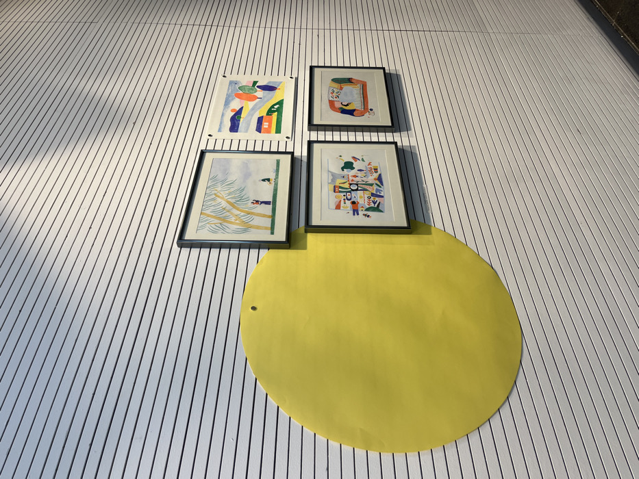 The scene depicts an art display on a horizontally striped white wall inside the Médiathèque de Sélestat, France. A large, bright yellow paper circle, slightly creased, is affixed to the left portion of the wall with a single visible fastener near its top. To the right of the yellow circle, and partially overlapping its edge, are four framed illustrations arranged in a 2x2 grid. All frames are dark and slender. The top-left illustration features two stylized figures under yellow-leafed trees against a light blue sky. The top-right illustration presents a colorful landscape with a red house, rolling hills, and stylized trees. The bottom-left illustration is an abstract composition of various brightly colored shapes and forms. The bottom-right illustration features a stylized figure within a curvilinear, multi-colored interior setting.