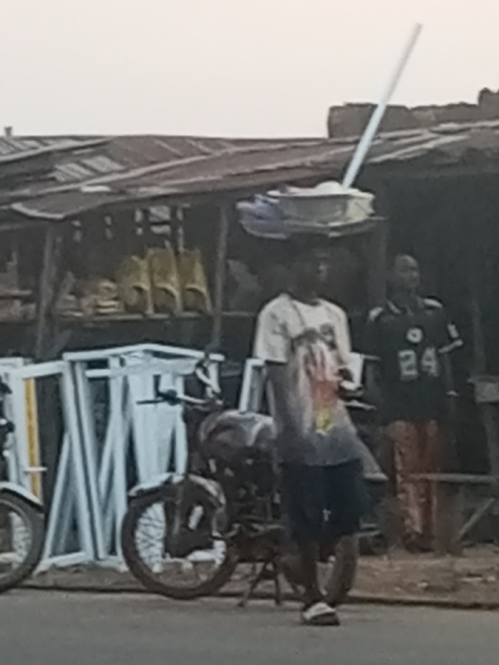 A person carries a large tray on their head, topped with a long white object, passing in front of a roadside shop. A motorcycle is parked in front of the shop with white framed objects leaning against it. Another person stands in the background wearing a sports jersey with the number 24 on it. The shop has a corrugated metal roof and various items displayed inside.