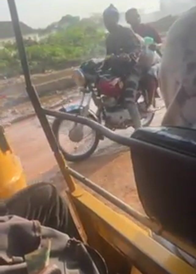 view from inside a yellow auto-rickshaw moving on a muddy, dirt road. Another motorcycle with two people on it drives past in the opposite direction. Smoke is visible in the background. The person holding the camera is holding some currency.