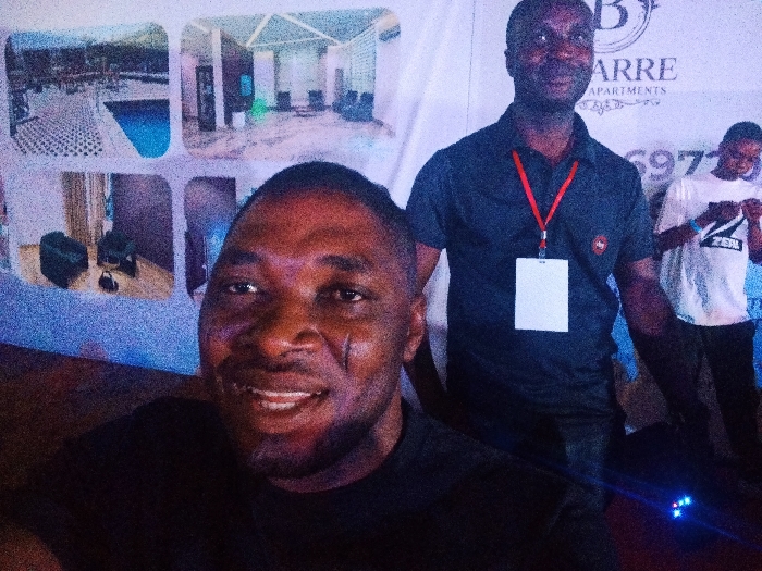 An indoor scene in Fagge D2, Nigeria, features three dark-skinned males positioned in front of a promotional banner. In the immediate foreground, a man with a prominent facial scar on his left cheek smiles directly into the camera. Behind him and slightly to the right stands a second man, wearing a dark polo shirt and a red lanyard with a blank white identification badge, also smiling. A third, younger male is partially visible in the background on the right, wearing a white t-shirt with "ZEN" visible on the front, looking downwards. The background banner displays multiple images, including an outdoor pool area, a modern interior living space, and a sitting room. Text on the banner includes "BARRE APARTMENTS" and a partial phone number starting with "697". The environment is illuminated by artificial light, casting a blue hue on the lower parts of the scene, with a small blue and red light source on the floor in the bottom right.