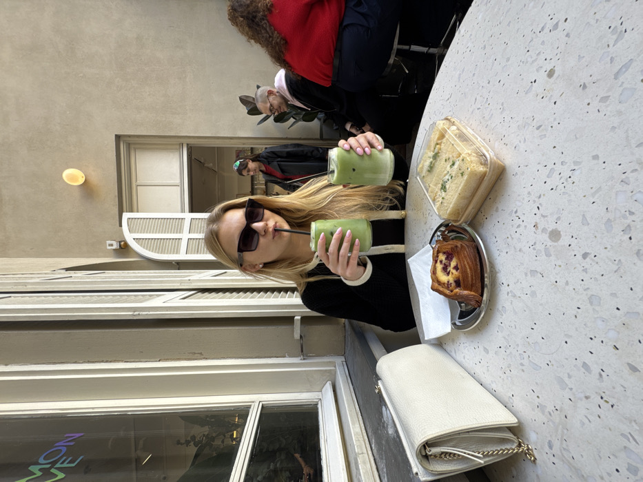 The image captures an outdoor cafe scene at MONDOVE, located at Lilienblum St 23, Tel Aviv-Yafo, Israel. A blonde female, appearing to be in her 20s, is seated at a round, light grey terrazzo-patterned table. She wears black rectangular sunglasses and a black long-sleeved top with a white trim, accented by light pink nail polish. She holds two clear glass cups containing a light green liquid, likely matcha lattes. Her right hand holds one cup, while her left hand holds the other cup to her mouth, actively drinking through a black straw. On the table, to the left of the woman, rests a cream-colored textured clutch bag with a gold chain strap. Centered on the table is a small silver plate holding a square pastry, possibly a Danish, topped with a yellow custard and red fruit pieces. A folded white napkin is positioned beneath the plate. To the right of the pastry, a clear plastic container holds four small, crustless square sandwiches. The background consists of a light beige stucco wall. To the left, a large window reflects interior greenery and displays a partial neon sign with the words "MON LOVE". To the right, an open doorway with white louvered shutters leads into the cafe interior. A circular, yellow-orange wall sconce is mounted above the doorway. Several other patrons are present: a woman with long, curly reddish-brown hair, wearing a red top, is seated with her back partially visible; a bald man with glasses and a light beard, wearing a dark hoodie with a pink lining, is seated further back; and a woman with dark hair, wearing a red top and dark jacket with a green headband, stands near the doorway. A dark potted plant is visible behind the seated man. The scene is illuminated by natural daylight.