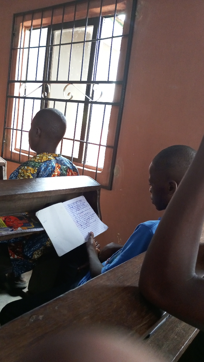 This image depicts an interior scene, identified as a location in Agburu Uke, Nigeria, consistent with a classroom setting