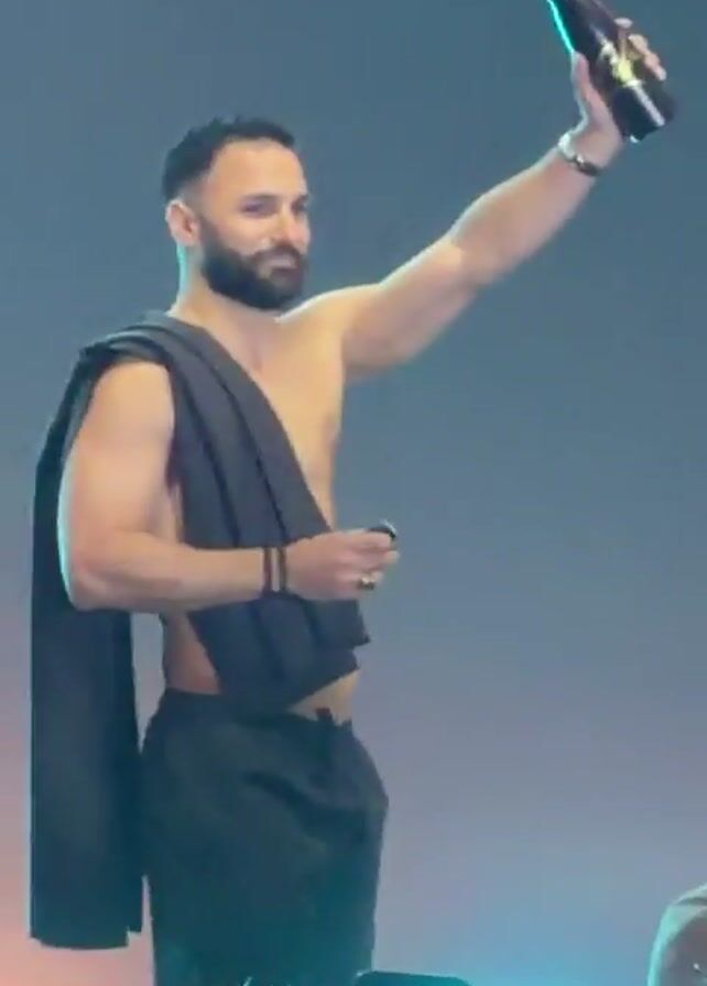A man with dark hair and a beard stands on a stage, mostly shirtless, with a black garment draped over his left shoulder and wearing black shorts. He holds up a dark bottle in his right hand, then lowers it, bends down, and seems to pick something up. He then looks up and smiles. The background is a solid, pale color. There is a crowd visible in the foreground, holding up phones.