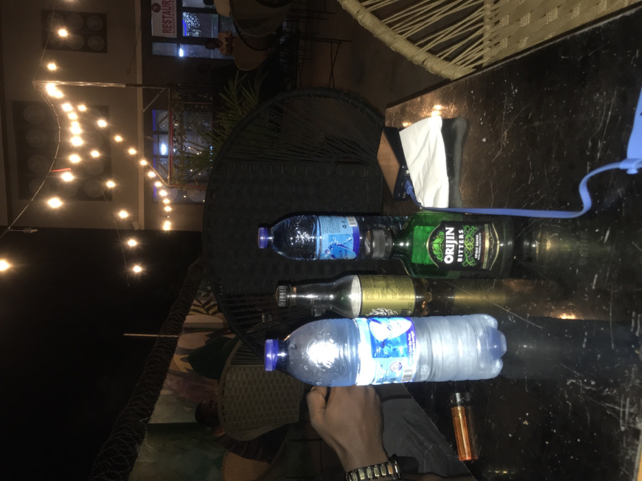 Three bottles line a shiny black surface alongside an orange lighter. Two are filled with clear liquid, while one is a green-labeled "Orijin Bitters" bottle. A dark wicker chair sits beside the table. A hand and beaded bracelet are visible. Overhead, string lights illuminate a building facade with circular motifs and a "Restaurant" sign. A white napkin and blue strap are also on the table.