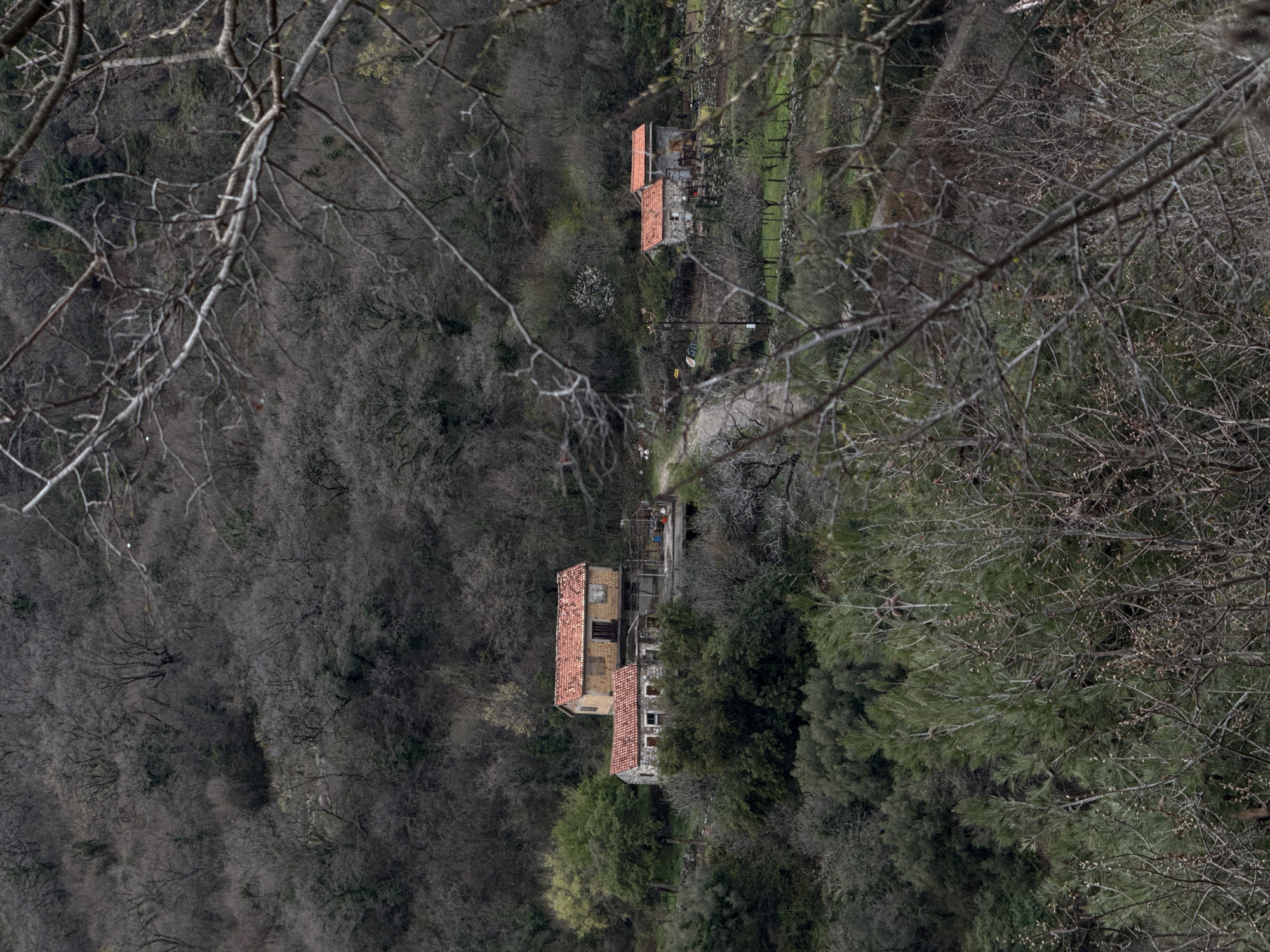 This image depicts a rural mountainous landscape in Krapina, Montenegro, under overcast conditions, characteristic of late winter or early spring. The scene is observed from an elevated vantage point, with out-of-focus, bare deciduous branches partially obscuring the immediate foreground. The midground features two distinct clusters of buildings nestled on a tree-covered hillside. To the left, a larger complex consists of at least two stone structures with red-tiled roofs. The lower building is a single story, while the upper structure is two stories, featuring a lighter-colored upper facade and a small, dark balcony or ledge. Several windows on both buildings appear to be boarded up or shuttered. A concrete or paved terrace extends from the lower structure, upon which various items, including barrels, a blue plastic container, and other miscellaneous objects, are visible. A dirt or gravel path winds through the landscape, connecting the two building clusters. To the right of the path, a second, smaller cluster comprises two modest, single-story stone buildings, also topped with red-tiled roofs. These structures are situated within fenced plots of green grass and cultivated areas, marked by stone walls. A single utility pole with wires stands near the path. Behind these smaller buildings, a tree or shrub with white blossoms is visible. Further up the distant hillside, amidst the bare trees, small, light-colored forms consistent with livestock (e.g., sheep or goats) are discernible. The background is dominated by densely forested hills, composed primarily of bare deciduous trees with some patches of evergreen foliage, indicating a period outside of full leaf. No individuals are visible within the frame.