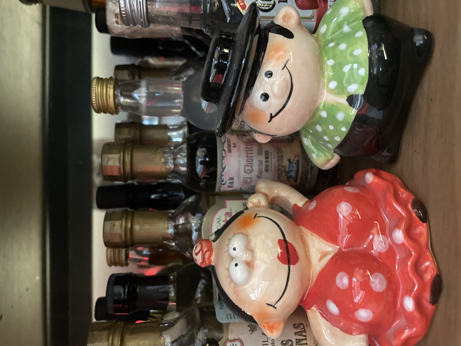 Two ceramic figurines, a man in a sombrero and a woman in a red polka-dot dress, lie among miniature liquor bottles with various gold, black, and silver tops