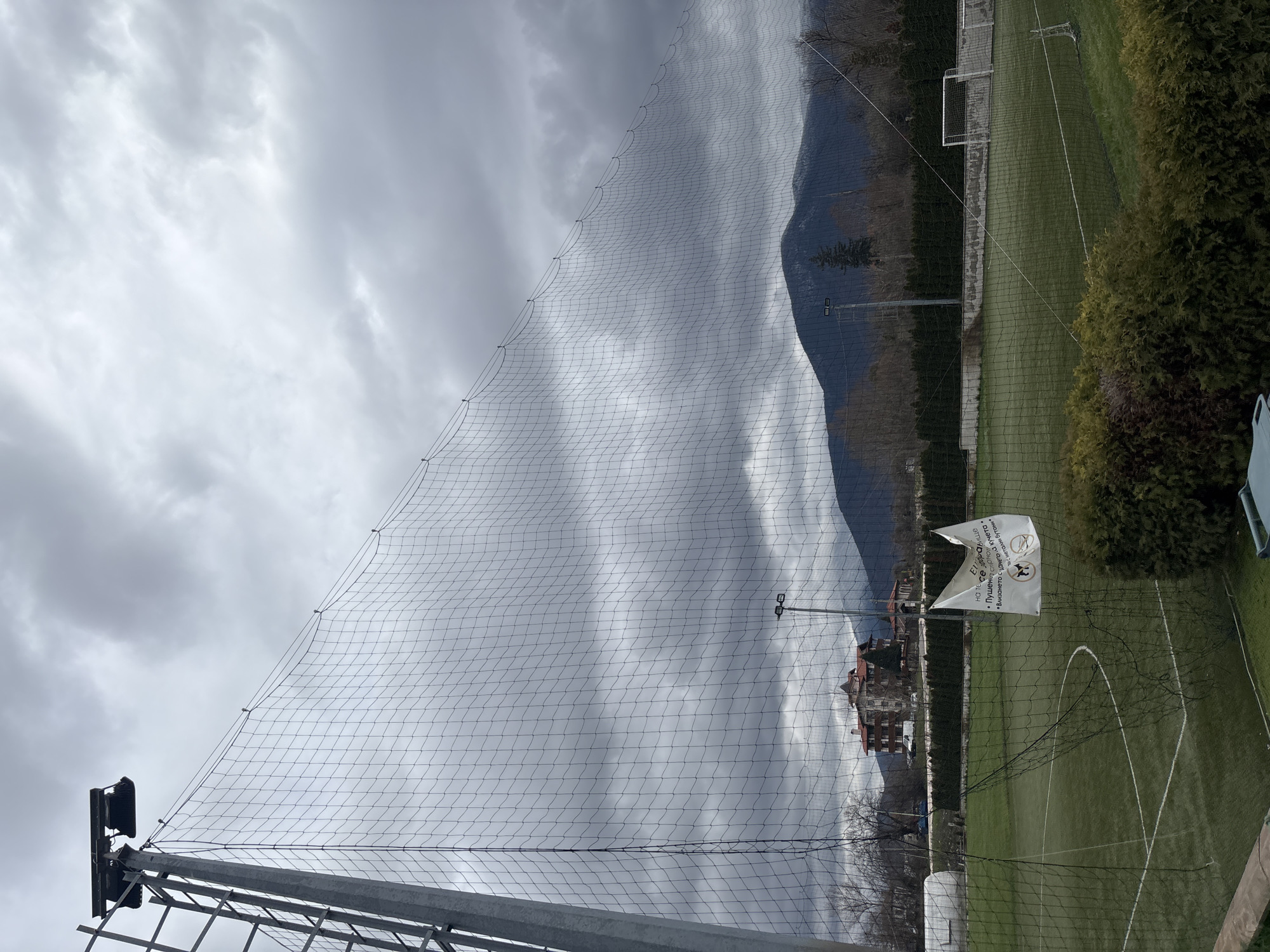 The image captures a view of a sports field, possibly a tennis court or small soccer field, located in Dolna Banya, Bulgaria. The scene is overcast, with heavy gray clouds filling the sky. A tall net, likely part of the field's enclosure, dominates the left side of the frame. The net is attached to a metal structure with lights mounted on top. Behind the net, a mountain range is visible in the distance. On the right side of the frame, the green sports field is visible with white lines marking the boundaries. A net runs along the side of the field with a white sign affixed to it. The sign contains text in a local language. Beyond the field, there's a hedge or line of bushes. Further back, a building with a red roof is visible. The overall impression is of a sports field located in a mountainous region on a cloudy day.