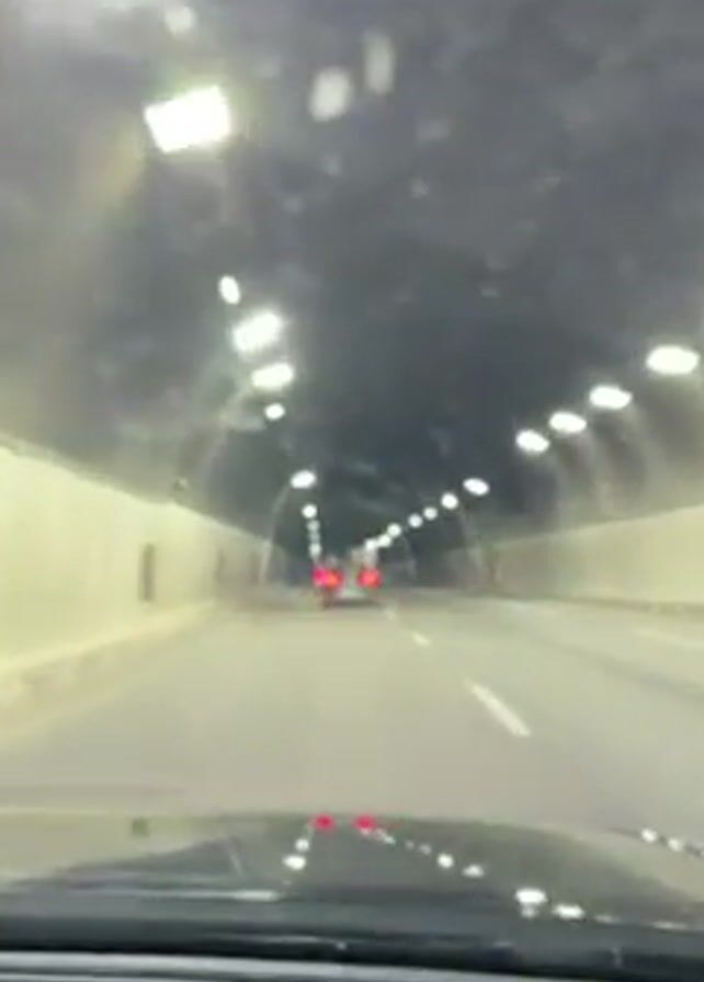perspective of someone driving through a tunnel. The tunnel is lit by rows of lights along the arched ceiling. There are other cars ahead, visible by their red taillights. The windshield appears a bit dirty. The road markings are visible, including a white lane divider.