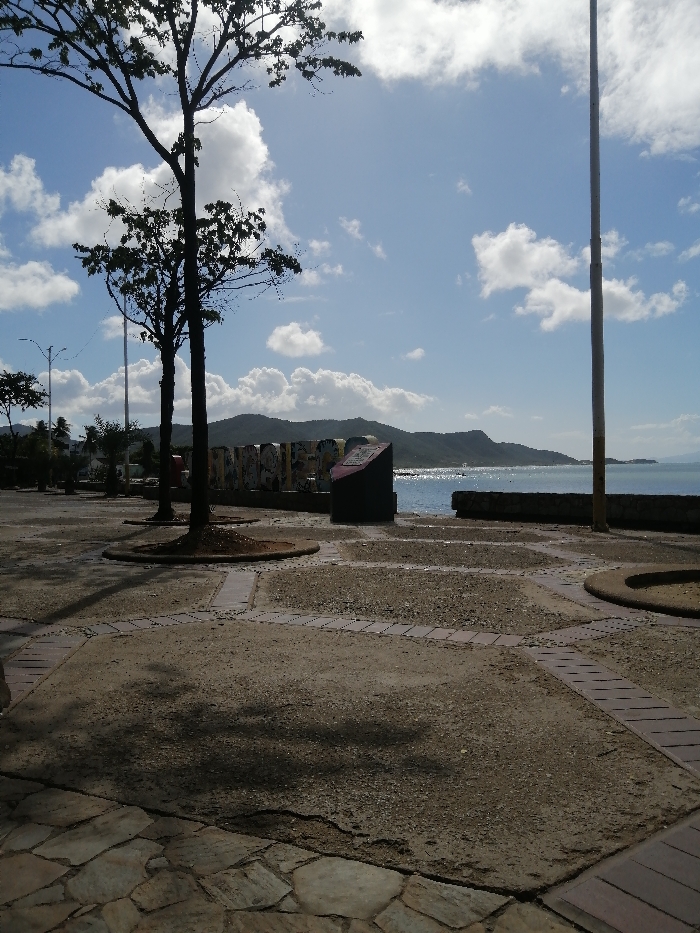 A sun-drenched outdoor scene reveals a patterned ground of stone and aggregate leading to a coastal view. A row of painted blocks and a dark monument stand near the water's edge. Beyond, a calm sea stretches toward a distant, hilly landmass under a blue sky dotted with fluffy white clouds. A solitary, tall pole and bare-branched trees punctuate the horizon, casting shadows on the paved area.