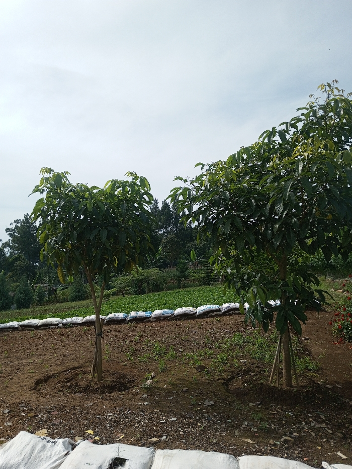 The image captures an agricultural landscape in Kandenuwara, Sri Lanka, under a bright, partly cloudy sky. The foreground and mid-ground consist of reddish-brown soil with sparse weeds and small stones. Two young trees with vibrant green foliage stand centrally; the tree on the right is supported by three slender wooden stakes. A line of white and blue filled sacks forms a boundary across the mid-ground, separating the bare soil from an active cultivated field featuring rows of dense green crops. The background reveals densely forested hills and additional cultivated land under a light blue sky. No individuals are present in the scene.