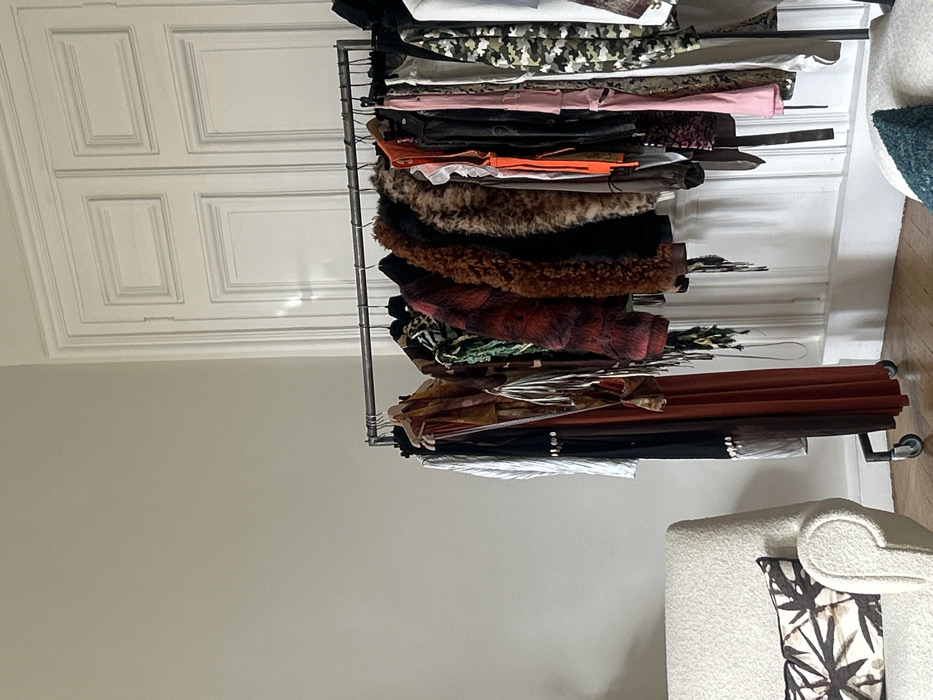 An indoor static scene showcases a metal clothing rack, mounted on casters, positioned in an interior space within Paris, France. The room features architectural elements consistent with Haussmannian design, including a tall, white, paneled double door with prominent molding and a white baseboard, set against a plain light-colored wall. The floor is wooden. The rack displays a dense collection of garments, comprising various coats (some with textured, fur-like exteriors in brown and deep red hues), dresses, shirts, and tops. Colors and patterns observed include black, white, rust, green, camouflage, and animal prints. A small, fringed bag is visible hanging amongst the apparel. In the lower-left, a section of a light-colored, upholstered armchair is visible, topped with a decorative pillow featuring a dark, possibly botanical, pattern. A small teal cushion is partially visible on the floor in the lower-right. No individuals or active subjects are present.
