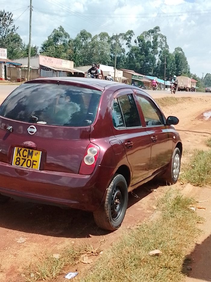 A dark red Nissan hatchback, bearing Kenyan license plate KCM 870F, is parked on an unpaved roadside in Chevaywa ward, Kenya