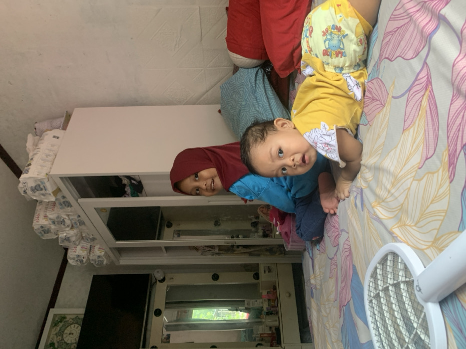 Two children are in a bedroom. One child, wearing a burgundy hijab and a blue shirt, is smiling. The other child, wearing a yellow shirt, is peering at the camera. Behind the first child is a white shelving unit with various items stored on its shelves. Behind the second child is a bed covered with a floral-patterned sheet. A fan is on the bed as well, near the child.