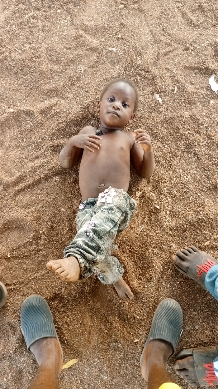 - "A young child lies on a gritty surface, possibly sand, wearing patterned pants and a necklace" by FM-VWSef2, licensed under CC BY 4.0