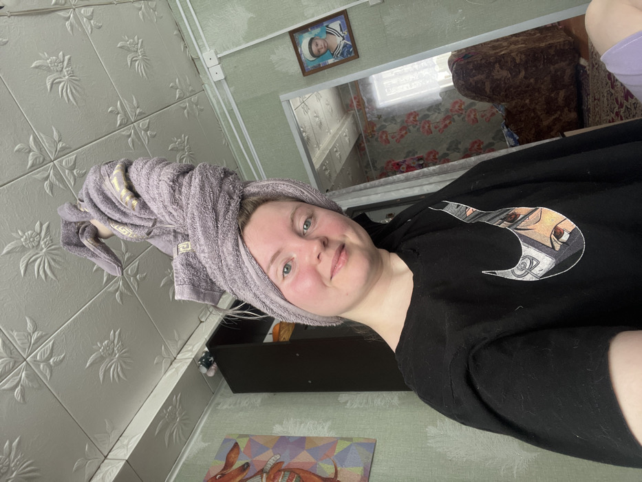An indoor selfie captures a young adult female smiling directly at the camera. Her hair is wrapped in a lavender towel, styled into a turban, with a second lavender towel featuring a gold-patterned Fendi logo draped over the top. She wears a black short-sleeved t-shirt with a white Nike swoosh graphic containing anime-style eyes. The ceiling in the foreground room is white with embossed floral patterns. Behind her, to the left, a dark wardrobe is visible, along with a framed abstract artwork depicting an orange and white fox-like figure on a light green wall. Two white electrical outlets are mounted on the upper part of this wall. To her right, a doorway leads to an adjacent room with floral wallpaper featuring red and pink patterns. In this adjacent room, a framed portrait of a young boy in a sailor uniform hangs on the wall. A brown upholstered armchair and a patterned rug are visible, along with a window covered by a sheer curtain in the background, indicating ambient daylight. This scene is located in a residential setting in Дойная, Russia.