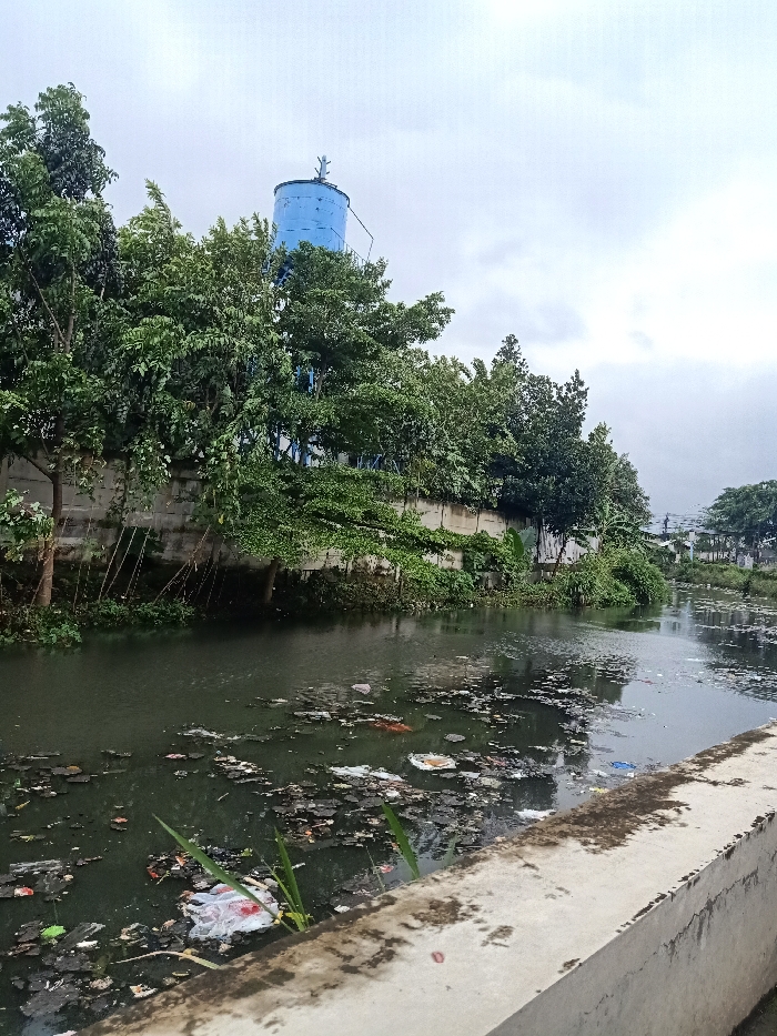 A murky canal overflowing with trash contrasts with the cloudy sky. A concrete retaining wall lines the canal, supporting a dense row of trees and a blue water tower perched on the rise behind them. The water is heavily polluted with scattered debris. The scene evokes a sense of environmental neglect and urban decay.
