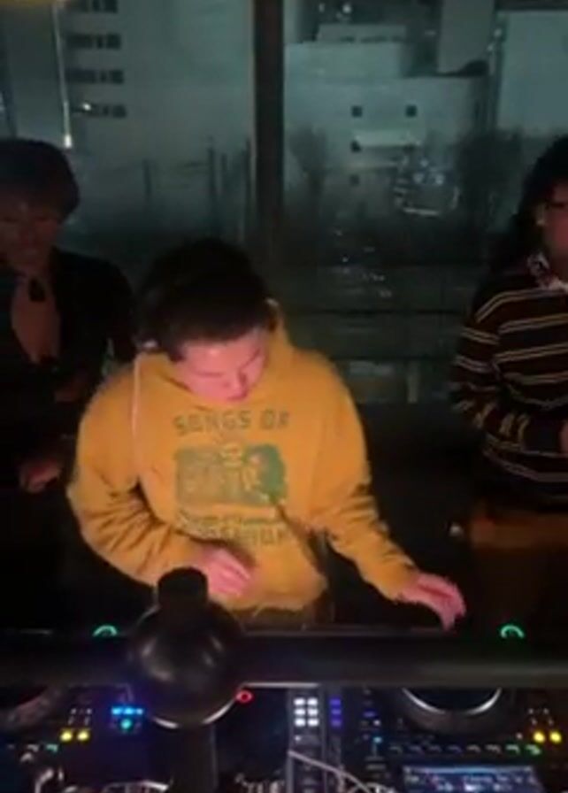 Three people are in a room with a DJ setup. The person in the center is DJing, wearing headphones and a yellow hoodie with a graphic. To their left, a person in a black top and corset stands with their arms crossed. To the right, another person in a striped shirt is looking at a phone. Behind them, a large window reveals a city skyline at night. The DJ is moving their hands on the equipment.