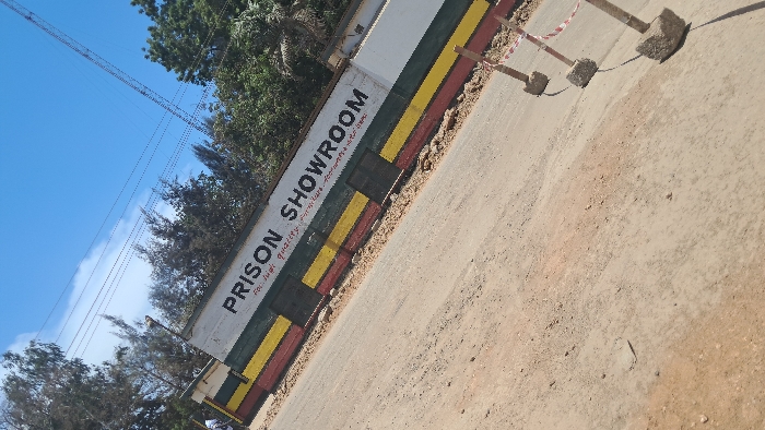 This image depicts an outdoor scene in Shanzu ward, Kenya, captured with a diagonal orientation under a clear blue sky with scattered white clouds. The main subject is a low white wall or building facade extending horizontally across the mid-ground. Prominently painted on the upper white section in black capital letters is "PRISON SHOWROOM," with smaller black text below it reading "for high quality furniture & handicrafts." The lower part of the wall features multiple horizontal bands of color: red, yellow, green, a wider green segment, followed by red, yellow, and green again, from bottom to top. Dark, rectangular features, possibly sealed windows or doors, are visible within the colored bands. The foreground consists of an unpaved road or dirt shoulder, composed of light brown/tan soil and gravel. On the right side of this foreground, three concrete bollard-like structures are positioned, connected by white and red striped barrier tape. Behind the wall, dense green foliage from various trees is visible, with sparse taller trees extending higher into the frame. Overhead, multiple utility lines traverse the blue sky. No identifiable individuals are present in the scene.