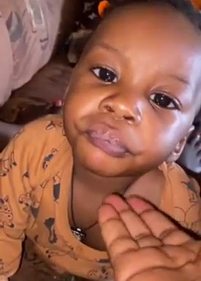 baby with dark skin and brown eyes, wearing a brown onesie with a pattern of small animals, and a necklace with a small, silver charm. Two pink and orange hair ties are visible in the baby's hair. The baby is facing the camera and sticking their tongue out slightly, with some saliva visible. A dark-skinned hand is near the baby's chin. The baby is sitting on what appears to be a bed, with a pillow visible in the background.