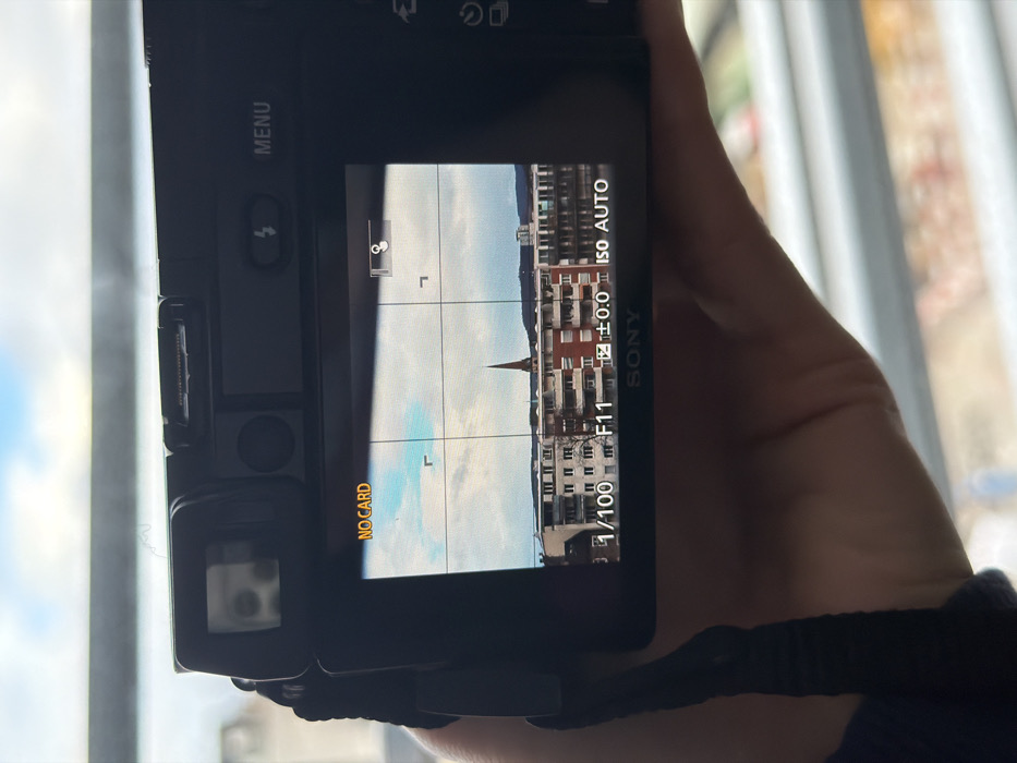 A human hand holds a black Sony mirrorless camera, angled to display its active rear LCD screen. The screen prominently displays the message "NO CARD" in yellow at the top left. The live view shows an urban landscape under a partly cloudy sky. In the midground, a distinctive reddish-brown church spire with a pointed roof rises above a cluster of multi-story residential buildings, which feature white and red-brown facades with numerous windows and balconies. This spire is identifiable as belonging to the St. Matthäuskirche (St. Matthew's Church) in Basel, Switzerland, located within the St. Johann district. Camera settings visible on the screen include a shutter speed of 1/100, an aperture of F11, exposure compensation at +/-0.0, and ISO AUTO. A grid overlay and a focus assist icon are also displayed. The "SONY" logo is visible at the bottom center of the screen. The immediate background outside the camera's frame is out of focus, revealing blurred horizontal elements consistent with railings or a window frame, suggesting the photograph was taken from an elevated position overlooking the city.