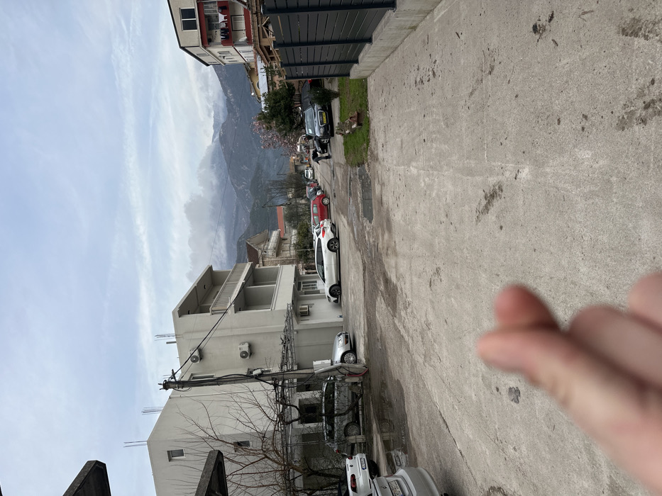 The image presents a street view in Lastva Grbaljska, Montenegro, under an overcast sky with distant mountains partially obscured by clouds. In the immediate foreground, a blurred human hand is visible at the bottom center, forming a finger heart gesture. The ground surface is a worn concrete or asphalt roadway, exhibiting dirt patches and several small puddles, particularly on the left side of the frame. To the left, a multi-story, light-colored building featuring multiple balconies and external air conditioning units lines the street. Exposed rebar on its roof suggests recent construction or ongoing work. A utility pole with numerous cables is positioned in front of this building. Several vehicles are parked along the left side of the street, including a silver station wagon, a white station wagon, and a white hatchback. On the right side, a dark gray slatted fence borders a small strip of green grass containing a weathered, low-lying wooden structure. Further down the street, another multi-story building is visible. Multiple cars are parked along the right curb, including red and dark-colored sedans/SUVs. One individual, dressed in dark attire, is observed leaning towards the front of a dark SUV, appearing to interact with the vehicle's hood or bumper area. A tree with distinct pink blossoms is visible further along the right side of the street. The background features a range of mountains, their upper slopes enshrouded by low-lying clouds.