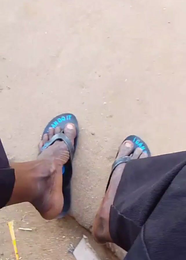 A first-person perspective shot shows the lower legs of a person wearing dark pants and black flip-flops