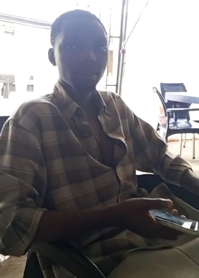 A young Black man is sitting in a chair in an open-air space, possibly a cafe or patio. He is wearing a brown and gray plaid shirt, partly unbuttoned, and light gray pants. He's holding a cell phone and taking a selfie or video of himself. Behind him are tables and chairs, and a fence-like structure. The light is bright, causing his face to be somewhat obscured by shadows. There is music playing in the background.