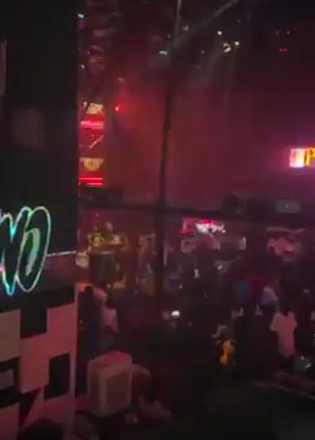 crowded nightclub interior, viewed from an elevated position. The space is dimly lit, with red and yellow stage lights creating a hazy atmosphere. Numerous people, mostly dark-skinned, are visible, dancing and socializing on the main floor and in an upper level. A black structure with white geometric patterns is visible on the left side of the frame, bearing a glowing sign. The structural beams of the building are visible in the background. The music is loud, indicating an active party atmosphere.