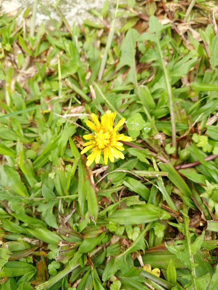 A vibrant yellow dandelion blossom centers the frame, surrounded by a dense carpet of green grass and broadleaf weeds