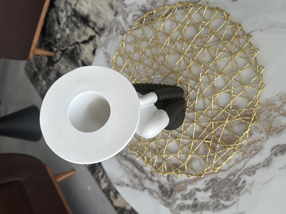 The image depicts an indoor setting in Jos, Nigeria. The primary subject is a decorative object positioned centrally on a round, golden, interwoven placemat. The object features a wide, flat, white circular top with a depressed center, a smooth white upper body, and a dark, horizontally ribbed lower body. This entire arrangement rests on a circular coffee table with a white and brown marble pattern. In the blurred background, a section of a brown leather armchair with light wooden legs is visible to the left. A dark-toned, patterned rug covers a portion of the floor, and a dark, conical object is partially discernible further back. No people or active interactions are present in the scene.