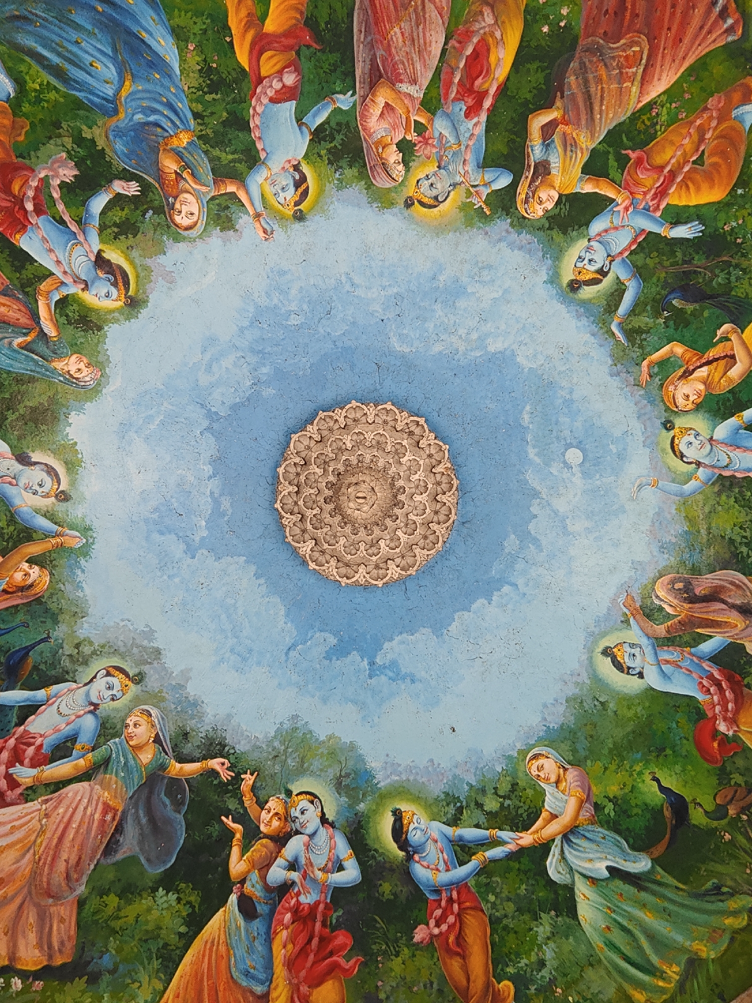 This image is a large, circular ceiling mural located in Kolhapur, India. Centrally positioned is an ornate, light brown, mandala-like circular relief. Surrounding this, approximately 24 figures are arranged in a circular formation. These figures include blue-skinned male characters, consistent with depictions of Krishna, adorned with garlands, necklaces, armlets, headgear, and other jewelry; some are depicted holding flutes. Interspersed are female figures, consistent with depictions of Gopis, wearing vibrant traditional Indian attire, specifically sarees and lehengas, in hues of red, orange, yellow, blue, and green, also accessorized with jewelry. Each figure exhibits a luminous golden halo around the head. Many figures are depicted holding hands with adjacent figures, and all are in dynamic poses suggesting movement and interaction, with some making direct eye contact. The background transitions from dense green foliage, suggestive of a forest or garden, on the outer perimeter to a light blue, cloud-textured sky towards the center. Several peacocks are visible within the green foliage at various points along the outer edge.